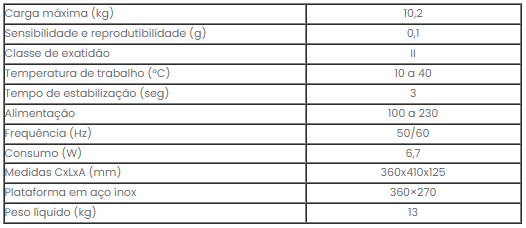 Balança eletrônica com capacidade de 10,2kg, precisão de 0,1g, com microprocessador, tara subtrativa em toda a escala.