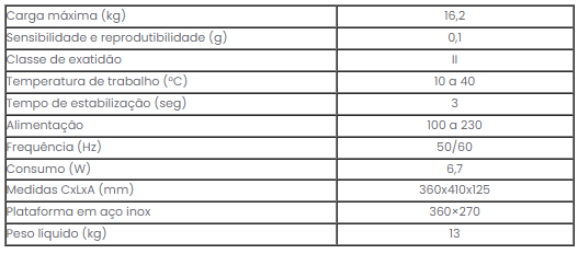 Balança eletrônica com capacidade de 16,2kg, precisão de 0,1g, com microprocessador, tara subtrativa em toda a escala.