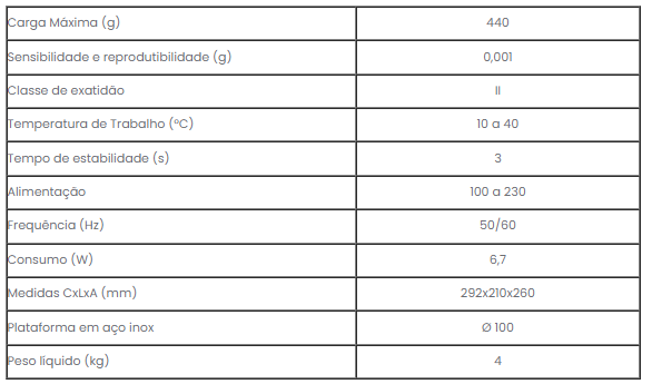 Balança eletrônica com capacidade de 440g, precisão de 0,001g, com microprocessador, tara subtrativa em toda a escala e com capela em acrílico transparente.