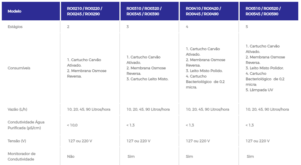 Equipamentos de uso laboratorial para tratamento de água por osmose reversa é indicado para aplicações onde se deseja ter uma água com níveis mínimos de sais dissolvidos, indicado para aplicações tais como química analítica, preparações de reagentes, química fina e pesquisas. Todo sistema de tratamento de água por osmose reversa é composto por pré-filtro de carvão ativado capaz de remover da água resíduos de origem orgânica e cloro por adsorção.