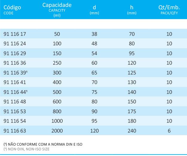 - Fabricado de acordo com as Normas ISO 3819, DIN 12331 e USP;