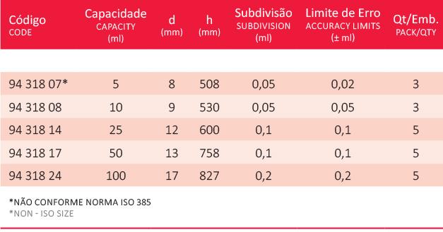 - Fabricado de acordo com as Normas ISO 385 e USP;